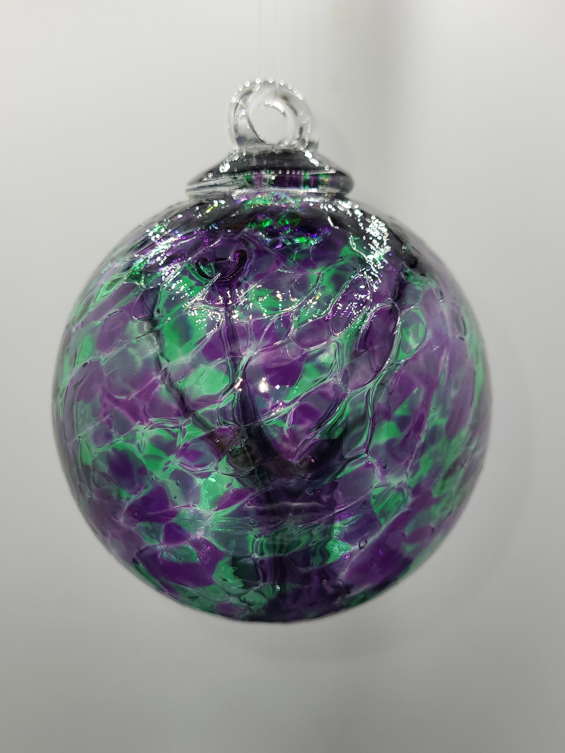 This small witch ball, titled Iris Bouquet, features soft purples and greens that echo the beauty of blooming irises. Handblown with an inner web to trap negative energy, it’s both symbolic and stunning—perfect for window sills, healing spaces, or thoughtful gifting.